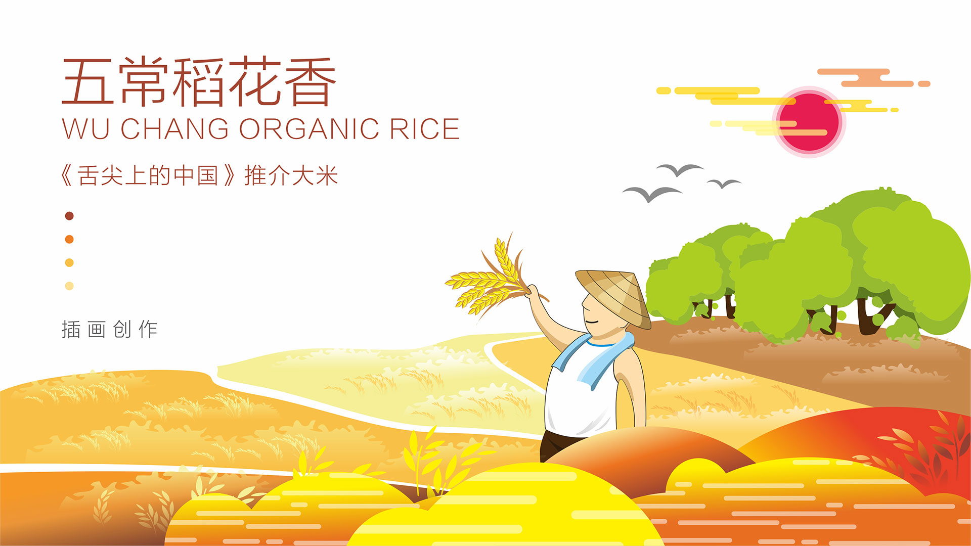三采用符合目標人群喜歡的手繪插畫表達五常大米生長的場景,體現出生態、自然和豐收的喜悅。
