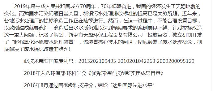 中國(guó)高新技術(shù)網(wǎng)發(fā)布:《關(guān)注:解碼科技創(chuàng)新》——新鄉(xiāng)市天盛環(huán)保“超強(qiáng)氧化還原廢水處理技術(shù)”